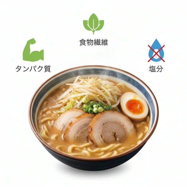 最も注意すべきは塩分で、1杯あたり6~8g含まれています。これは成人男性の1日推奨摂取量(7.5g)のほぼ全量、女性の推奨量(6.5g)を超える量です。濃厚味噌ラーメンは意図的に塩分を濃くしているため、この数値は避けられません。ただし、スープを全部飲まなければ塩分摂取量を50%以上減らせます。割りスープで薄めながら、麺と具材を楽しみ、スープは味見程度に留めるのが健康的な食べ方です。高血圧や腎臓に問題がある方は、月に1~2回の特別な食事として位置づけるべきです。