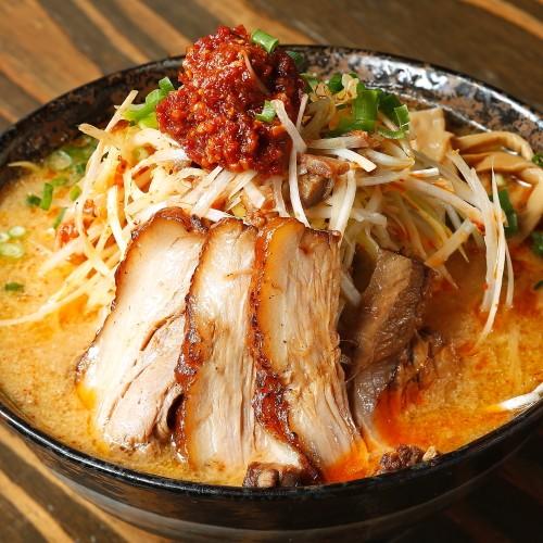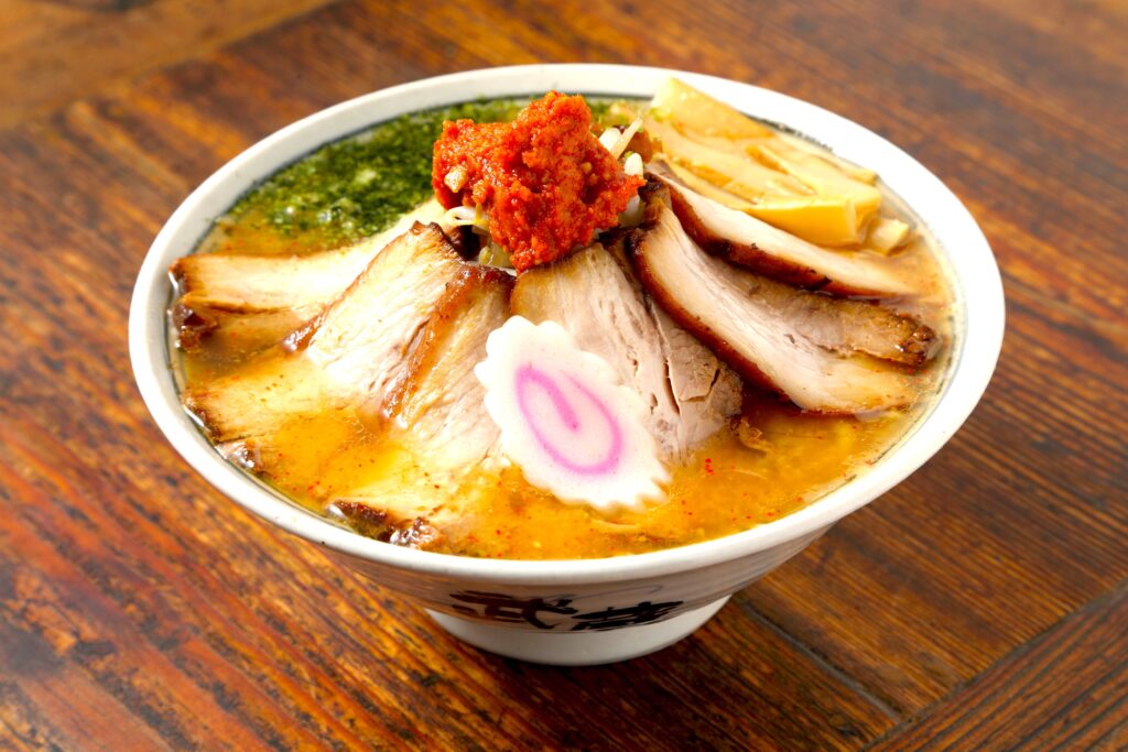 からし味噌らーめん(800~1,040円)が人気で、3種類の唐辛子を石臼で挽いた辛味噌と、10種類以上のスパイスを使用。チャーシューはモンドセレクション金賞を4年連続受賞しており、品質の高さが認められています。